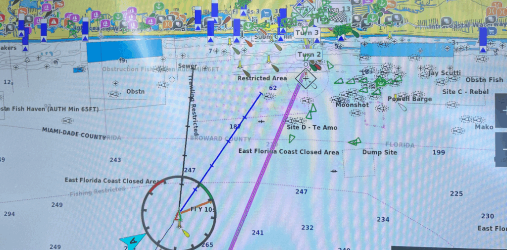 The trick is not to overdo it. Make small adjustments, check your progress often, and let the boat find its rhythm. We started out. On a heading of 260 and only adjust slightly north as we neared the Port Everglades Inlet. Better to undershoot than overshoot and have to fight the current to get back south.