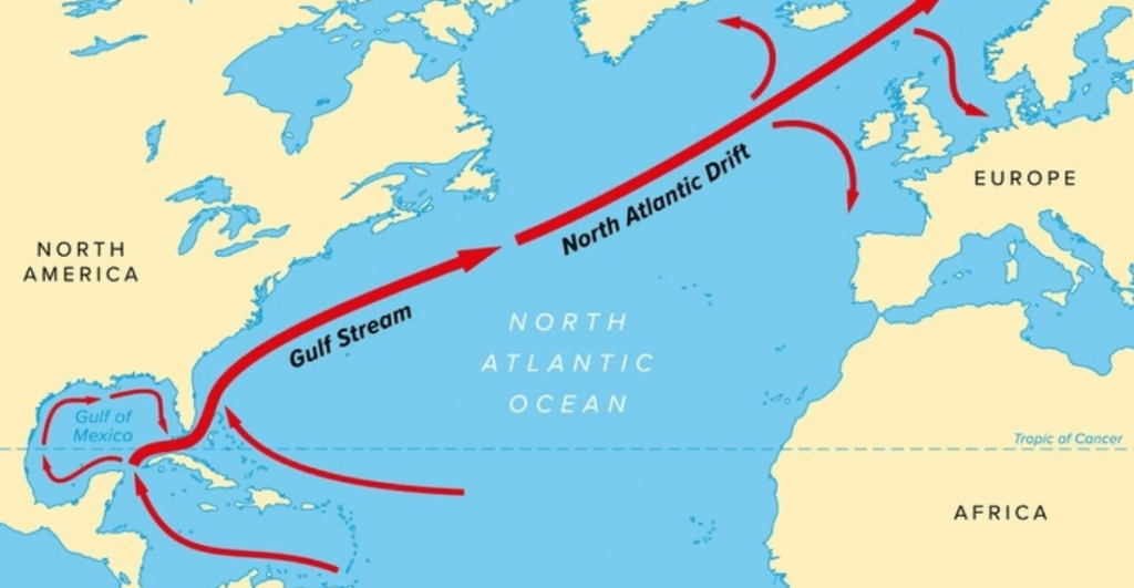The Gulf Stream is a powerful, warm ocean current flowing from the Gulf of Mexico through the Straits of Florida along the U.S. eastern coast. Off Florida, itâs sometimes called the Florida Current and is known for bringing warm, clear water close to shore.