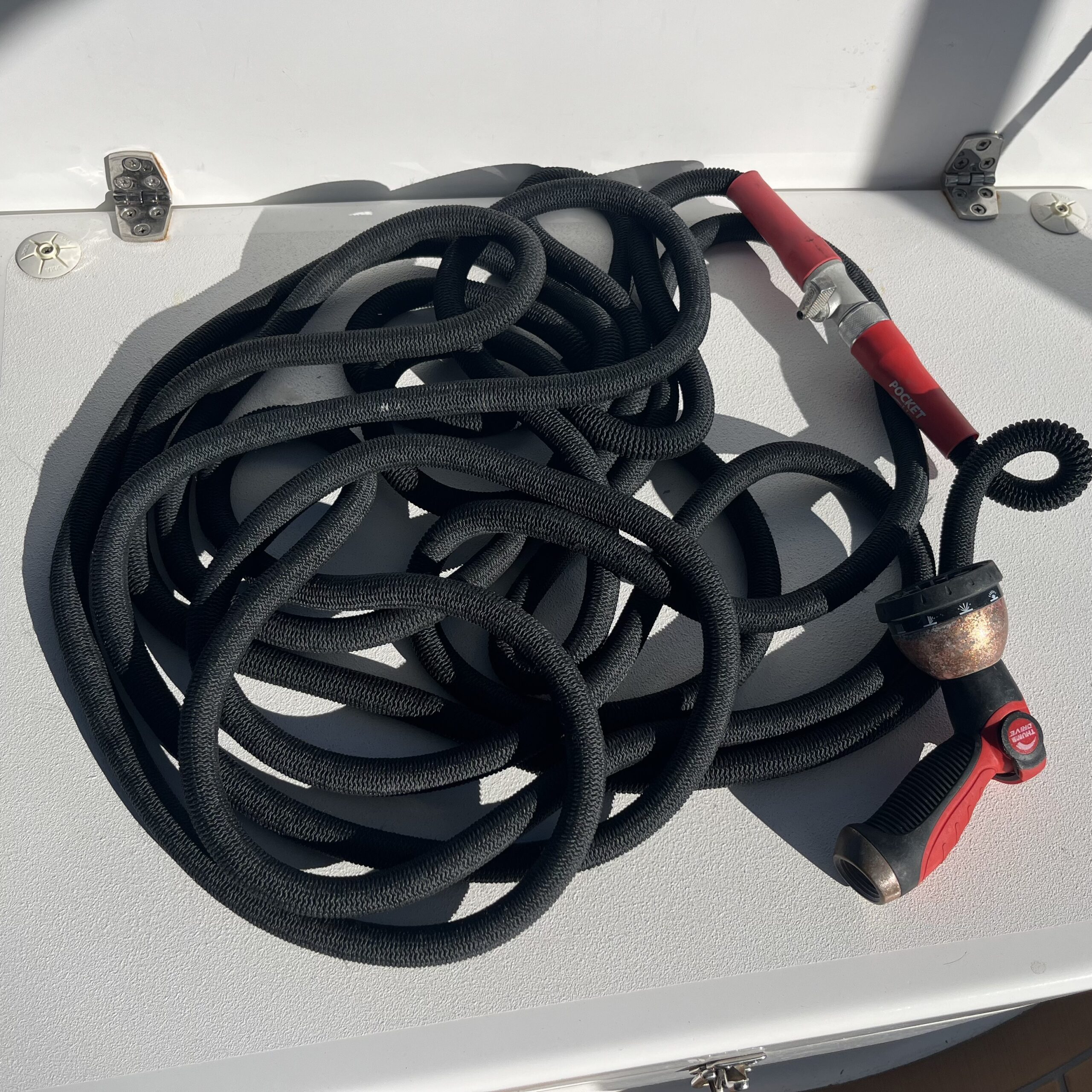 This hose expands when in use, shrinks down when youâre done, and the copper connector head is far more durable than plastic options. It gets rid of the hose smell/taste. Perfect for rinsing the boat, chain or filling tanks at the dock.