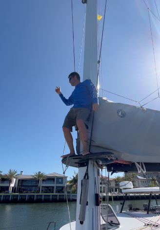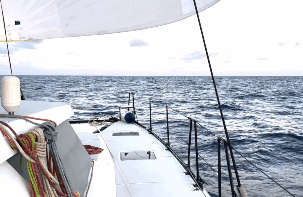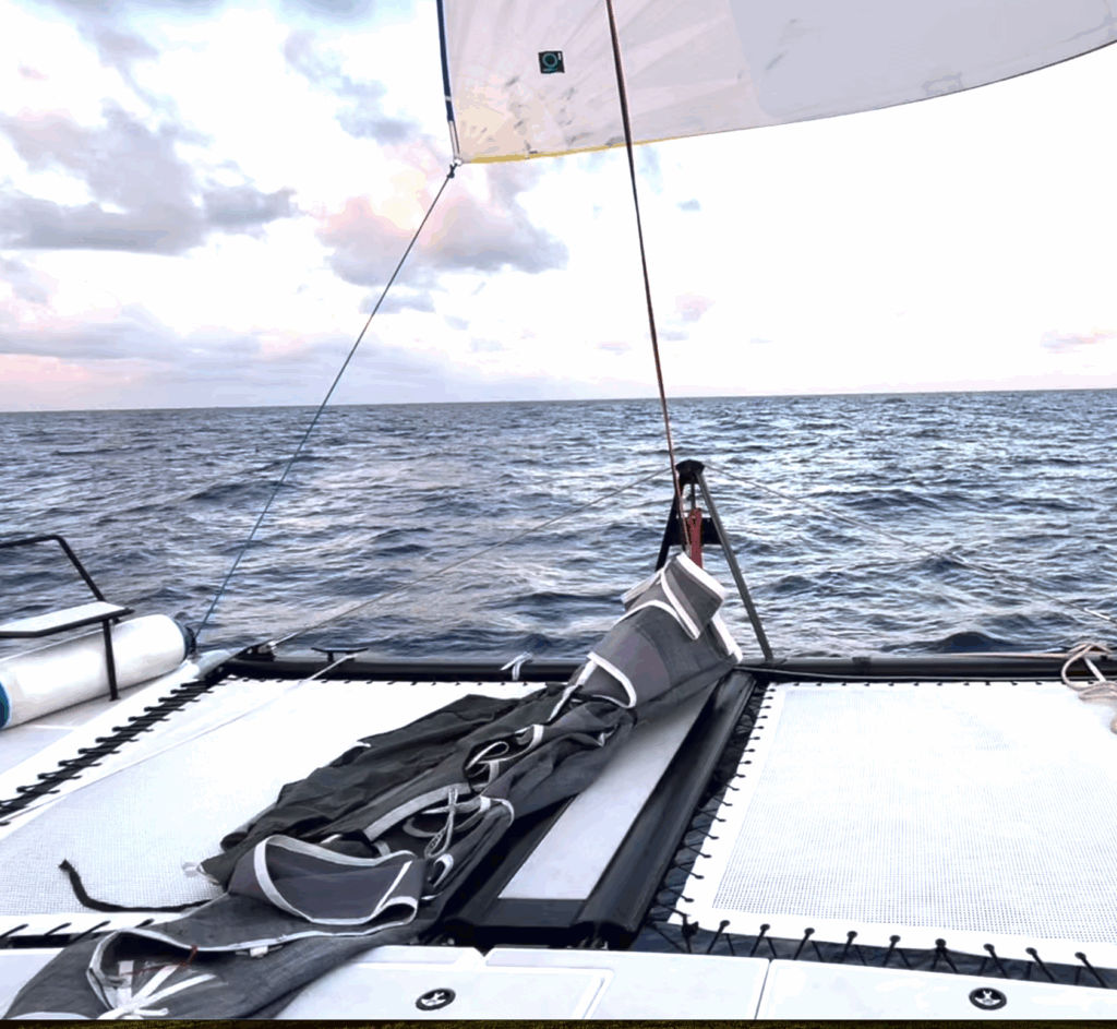 We told him — a sailing catamaran, spinnaker up. He couldn’t believe we were keeping pace at 6–8 knots under wind power while he burned through 6 gallons an hour.