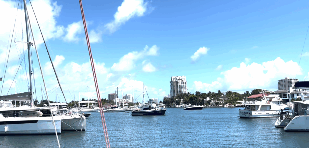 The bridge had just opened, and every powerboat in South Florida apparently decided now was the time to go full throttle. Jetskis darted like hornets, sportfishers roared by, and giant tankers lumbered through the channel. It was boating mayhem — pure, unfiltered chaos. (Think Dennis “Deacon” Hopper from Waterworld.)