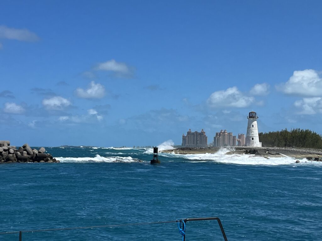 We slipped away from quiet, postcard-perfect Shroud Cay leaving behind the serene Exumas, hoisting sail for the Bahamian capital. With 16–19 knots on our beam, we flew—main and jib pulling us a solid 7–8 knots across 50 nautical miles. We had to once again do a little Jib sail repair as the already deteriorating sail material decided to sprout even more holes. Other than that it was smooth sailing… until we rounded the north end of New Providence. Then—bam—chop city. Suddenly the chop hit hard approaching the harbor entrance and the swells smacked us around while Atlantis loomed on the horizon like a Las Vegas mirage. Cruise ships slipped in and out of harbor while we gritted our teeth through the narrow inlet. Inside? Calm as glass.