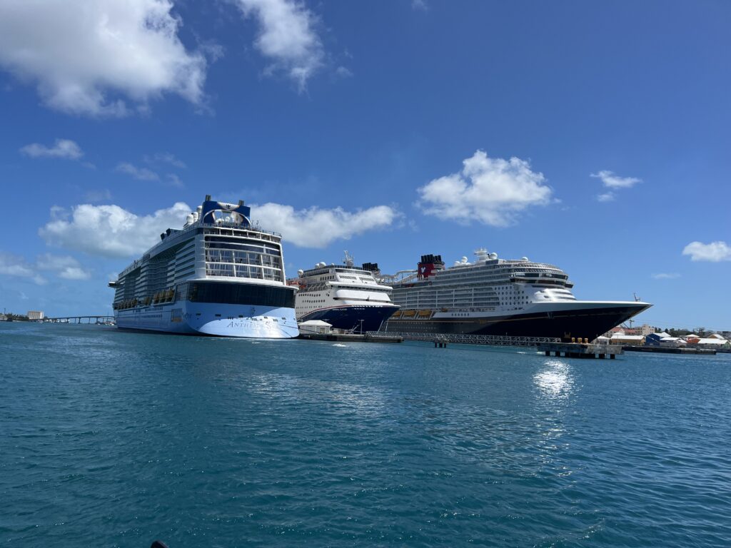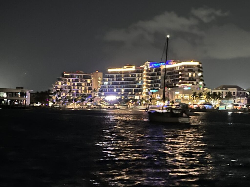 So back we went down “Cruise Ship Alley” providing entertainment for the floating city crowds, finally dropping hook off Junkanoo Beach. We dragged. Reset. Dragged again. Finally, the anchor bit into a thin patch of sand on rock. Not perfect, but good enough for four days—thankfully without strong winds to test it.