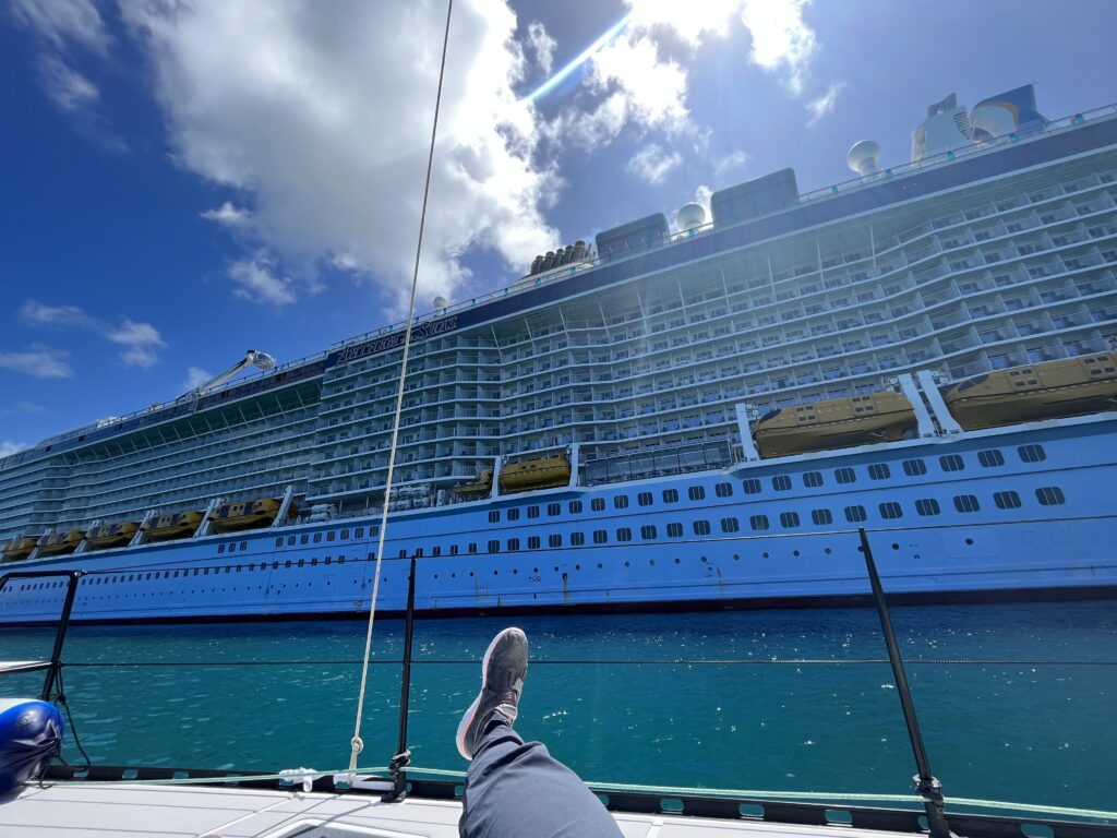 Decision time: anchor in the main harbor, or off Junkanoo Beach where holding was rumored to be… sketchy? We first cruised past the huge cruise ships. Seriously we were DWARFED as we waved at balcony passengers who were close enough to ask for sunscreen. But the inner harbor was a bumper-car mess of boats spinning in squirrelly currents. Hard Nope. The guy screaming off our bow that it was not a good spot for us. Noted.